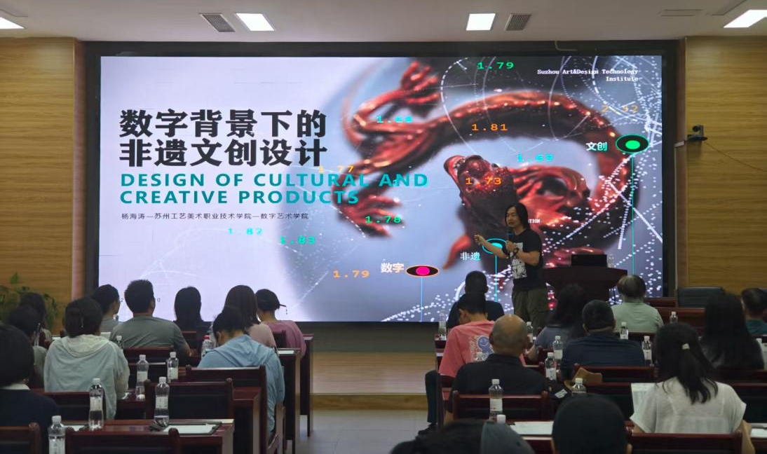 苏州工艺美术职业技术学院数字艺术学院副院长杨海涛以《数字背景下的非遗文创设计》为题作专题分享,立足非遗保护现状,结合数字技术应用案例,以严谨的学术态度和创新的设计思维,系统阐述了非遗文创的数字化转型策略。其深入浅出的理论解析、生动幽默的讲述风格,配合精彩的案例分析,引发与会专家强烈共鸣,为现场增添了浓厚的学术交流氛围。