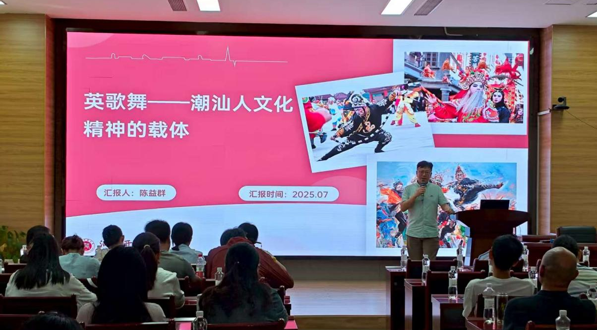 会上,多位专家学者也带来会议主题相关的经验分享。汕头开放大学党委书记陈益群做“英歌舞——潮汕人精神的载体”的报告,从英歌舞的历史背景、文化内涵、影响力等方面进行讨论,陈益群指出英歌舞对潮汕人生活信仰的重要性和作为中华民族传统文化组成部分的不可或缺性,也对近些年英歌舞火爆全网的现象进行了探讨;