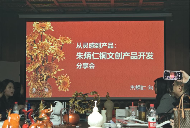 1月29日,各个院校的参培代表们实地参观考察朱炳仁铜研发生产基地(国家级非遗保护基地),亲身体验国家级非遗“铜雕技艺”的魅力,深入了解公司文创产品的设计与生产流程,感受传统工艺在当代的创新转化。随后在公司会议室召开朱炳仁铜文创产品开发分享会,各位专家学者围绕非遗技艺的活态传承、文创产品的市场化路径、传统美学与现代设计的融合等议题展开深入交流。分享会通过案例解析、现场问答、作品评鉴等环节,生动呈现了朱炳仁铜如何将文化积淀转化为兼具艺术价值与市场活力的文创产品,为非遗项目的当代发展提供了具有启发性的实践范例。