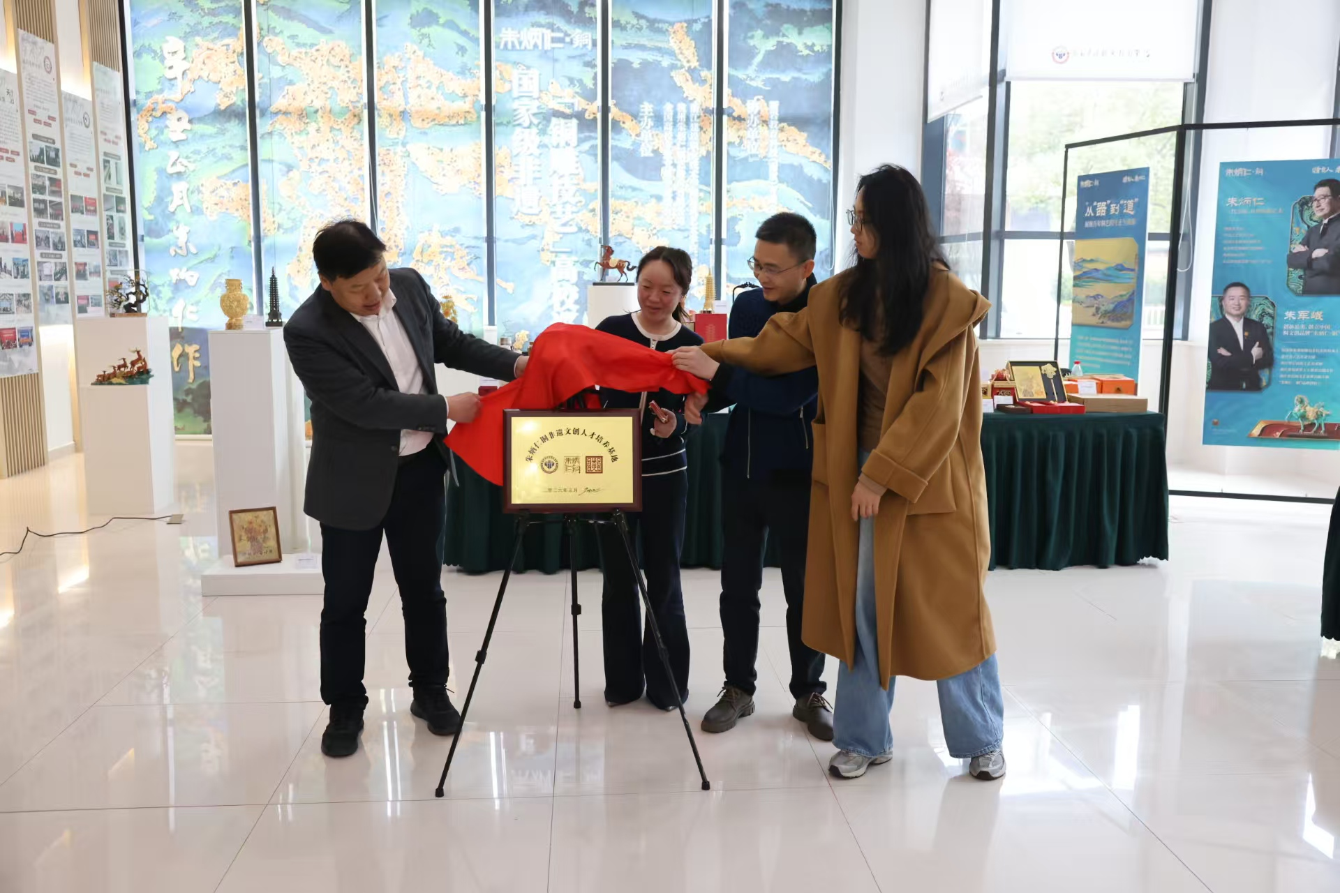 巡展开幕式上,浙江建设职业技术学院副校长陈东平表示,高校是文化传承的重要高地,本次学校引进的国家级非遗项目巡展,是落实立德树人根本任务、厚植工匠精神与民族自豪感的重要举措,将有力推动校地合作与产教融合,让中华传统工艺美育思想在校园生根发芽。随后,在全场嘉宾及师生的见证下,“朱炳仁铜非遗文创人才培养基地”正式揭牌。该基地依托上虞历史经典产业学院平台,标志着学校与朱炳仁·铜品牌在历史经典产业高技能人才培养、文创研发、产教融合等方面的合作迈入实质性阶段,将为铜雕技艺的活态传承注入新生力量。